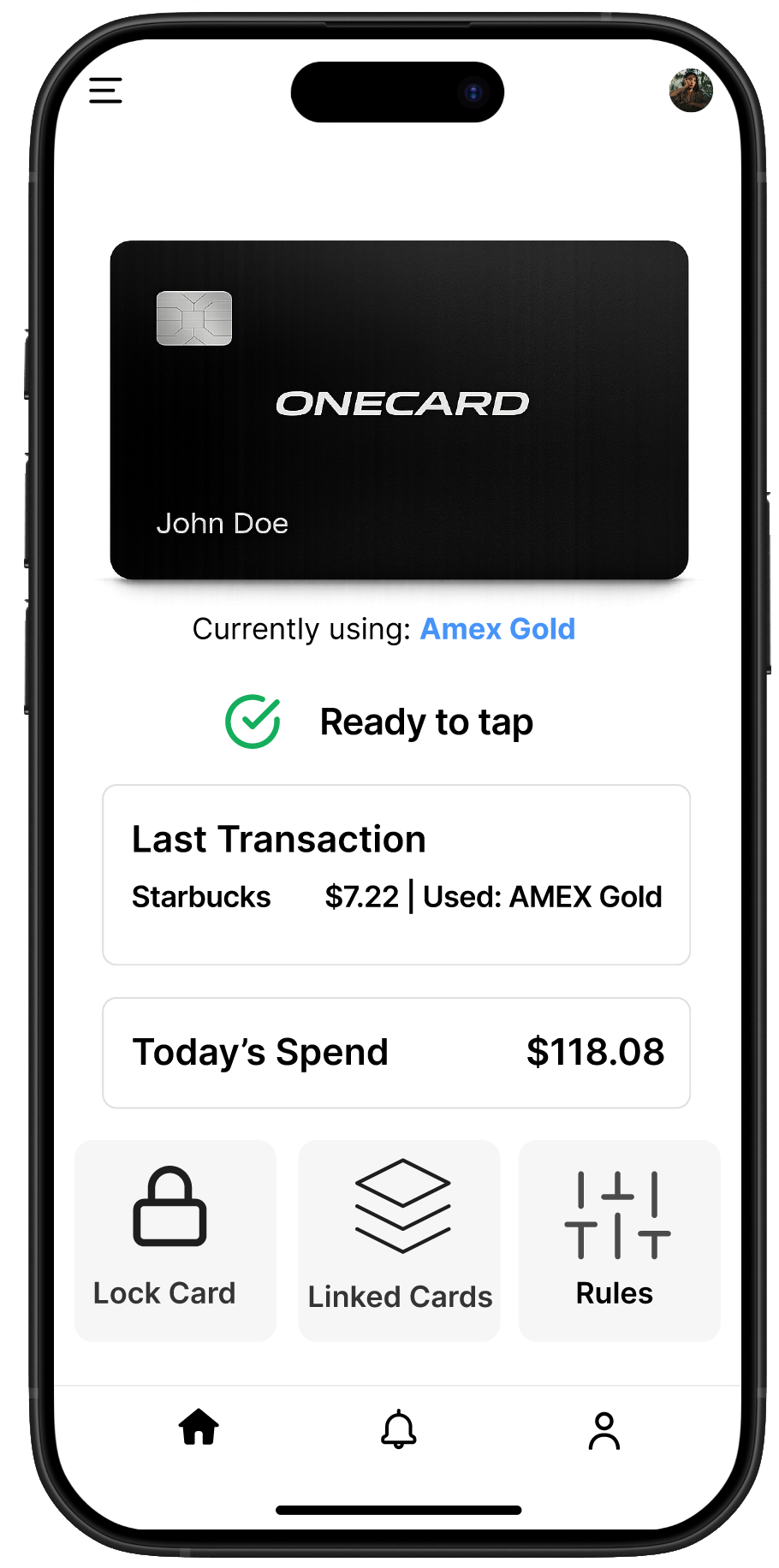 Stop losing points. Stop fumbling cards. ONECARD routes your payment to the highest reward option — no thinking, no apps to open.